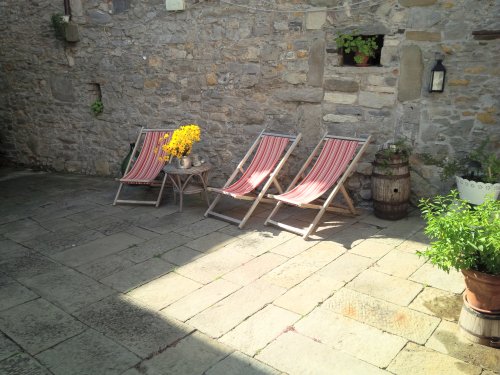 La corte, attrezzata con ombrelloni, tavoli, sedie, e barbecue è a disposizione degli ospiti della casa.