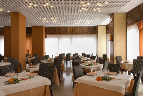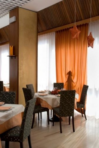 Cucina molto curata, menu a scelta con proposte di piatti nazionali e tipici, servizio al tavolo e al centro del ristorante ricco buffet di antipasti e verdure.
