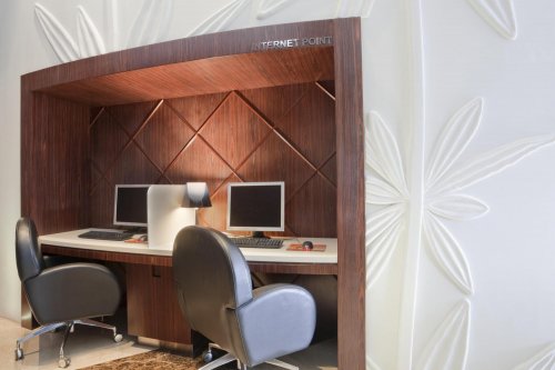 L’ambiente è decorato con stilizzati ornamenti floreali alle pareti, ed ogni postazione è equipaggiata con connessione Wi-Fi e le tecnologie più avanzate per ciò che riguarda stampanti, fax e fotocopie.