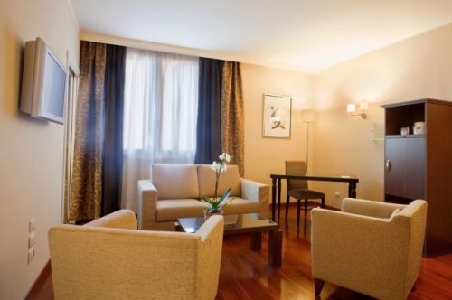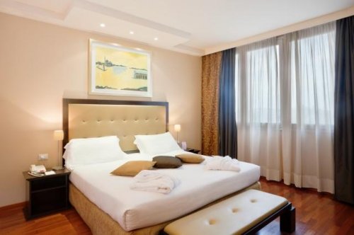 - Executive Suite di 50 mq arredata in stile classico e dotata di letto matrimoniale, luminoso salottino con pavimento in parquet, bagno rifinito in marmo grigio e decorato con mosaici, vasca e doccia Jacuzzi.