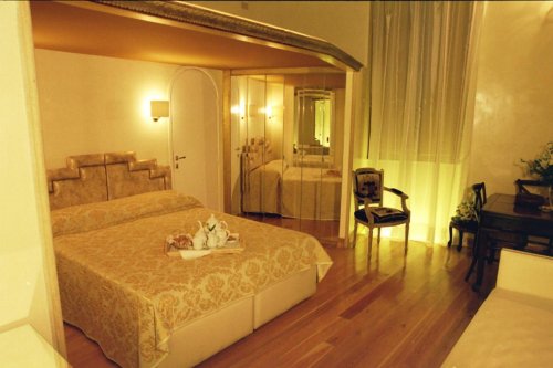 Junior Room di 20 mq (massimo 2 persone), con letto matrimoniale, tavolino con sedie, aria condizionata, TV color, telefono, cassaforte, piccolcucina con forno a microonde, frigorifero, bagno in travertino, con doccia, asciugacapelli.