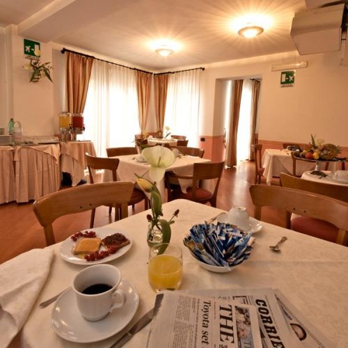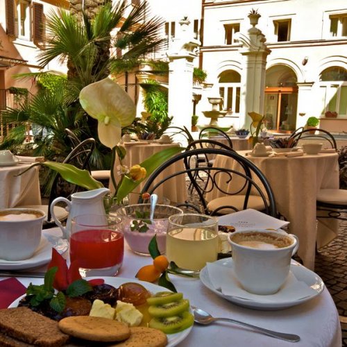 La ricca prima colazione al buffet viene offerta nella sala situata all’interno del cortile con splendida fontana.