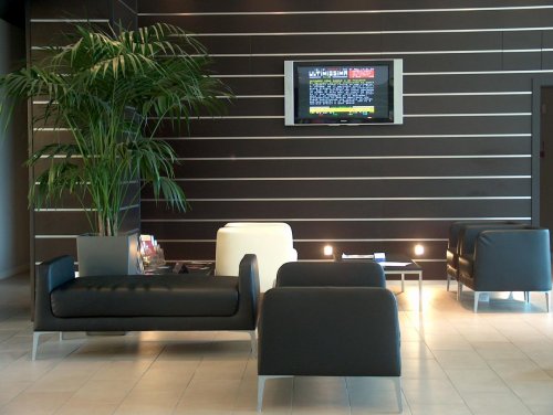 Arredi moderni, divani, chaise longue e un maxi schermo rendono la Hall un luogo piacevole e rilassante per stare in compagnia e sorseggiare un drink.