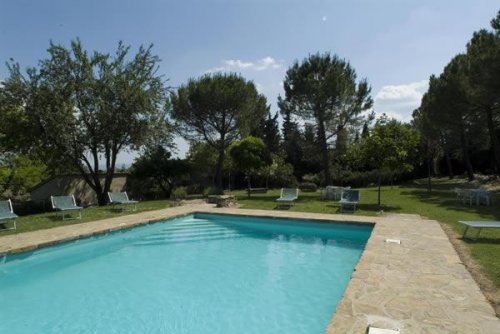 La splendida piscina è situata in un’area sopraelevata rispetto alle case, e gode di una vista a perdita d’occhio sulla campagna toscana. L'ampio prato con grandi alberi dispone di sedie, lettini e tavoli.