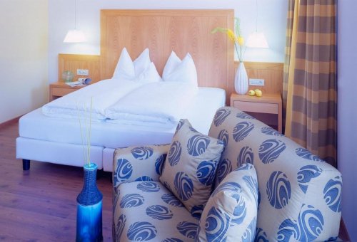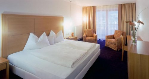 - La camera doppia “Ambiente”, con balcone sul lato sud e incantevole vista sul parco e sul Passo dello Stelvio, è dotata di TV color, telefono, cassaforte, bagno privato con doccia, bidet, asciugacapelli.