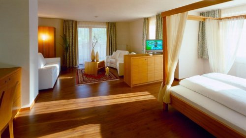 - La spaziosa camera “Giardino”, con letto matrimoniale e divano da trasformare in lettino per bambini, dispone di TV color, telefono, cassaforte, ampia terrazza con vista sull’Alta Venosta, bagno privato con doccia, bidet, asciugacapelli.