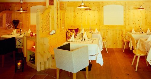Nel ristorante “Pineta”, gli elementi della tradizionale Stube tirolese in legno di cirmolo si armonizzano perfettamente con le linee sobrie e i moderni accessori.