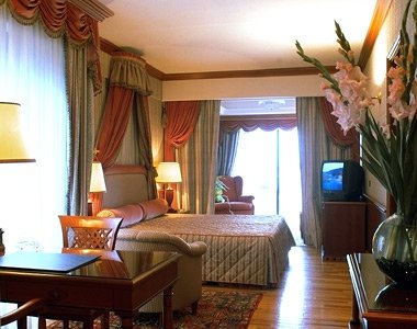 - Le suite sono composte da un ampia camera matrimoniale e da un salotto separato, sontuosamente arredati con essenze lignee e doppi tendaggi a drappeggio dai colori verde smeraldo, rosso rubino o giallo oro.