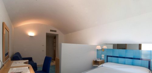 Le ampie camere dell'albergo si distinguono nello stile e nei colori, e sono variamente decorate in verde, azzurro, rosso, oppure in giallo.