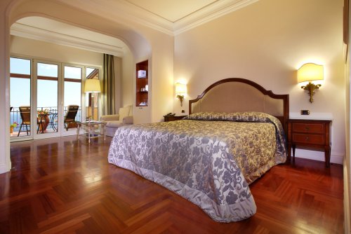 Junior Suite – Situate al primo e secondo pianto offrono tutte un ampio e lussuoso ambiente unico, con una confortevolecamera da letto, un accogliente salotto ed un balcone con vista mare dove su richiesta viene servita la colazione o la cena, per iniziare o finire la giornata davanti allo splendido panorama della Riviera di Taormina..