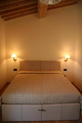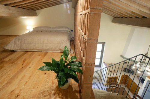 L'appartamento dispone di soggiorno (mq 17) con angolo cottura in muratura e pavimento in cotto smaltato bianco, divano, scala in marmo per accedere al soppalco con tetto spiovente (1 mt e 80 cm nel punto più alto) in parquet, letto matrimoniale e letto singolo, camera con letto matrimoniale e pavimento in parquet, camera con letto alla francese, bagno privato con doccia e secondo bagno con piatto doccia in travertino.