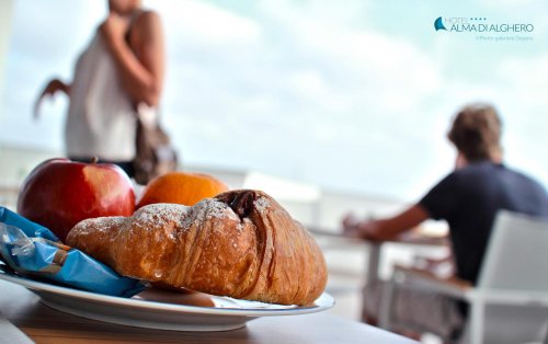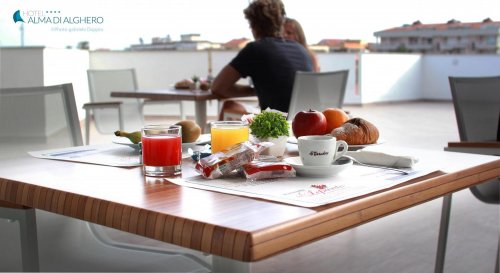 L’Hotel Alma di Alghero offre ai suoi ospiti un ricco buffet per cominciare la giornata con una colazione appetitosa arricchita anche da gustose torte preparate con cura da consumare nella bellissima terrazza panoramica situata all'ultimo piano.
