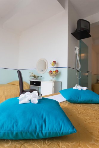 Le camere dell'Hotel Arizona sono accuratamente arredate arredate con un fresco e arioso stile marinaresco.