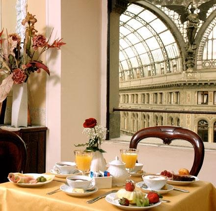 L'hotel dispone di un'accogliente sala colazione che si affaccia sulla Galleria Umberto dove viene servito un ricco e variegato buffet dalle ore 07:00 alle ore 10:30.