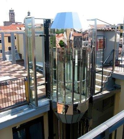 Dall'ascensore che accompagna alle camere è possibile ammirare un suggestivo squarcio della Laguna.