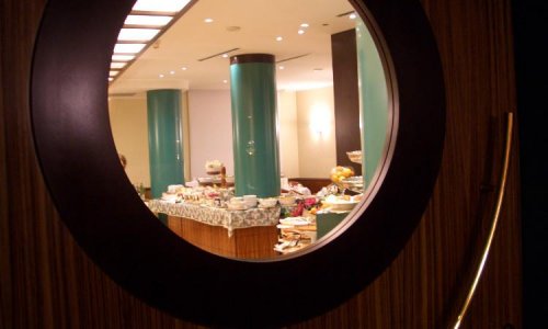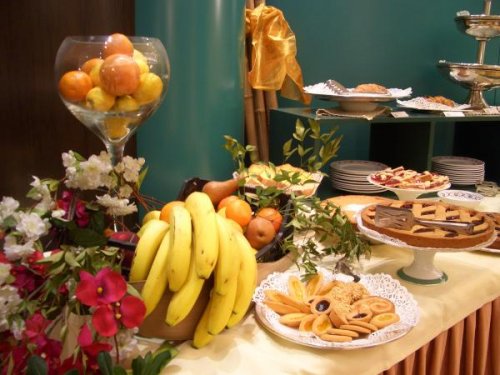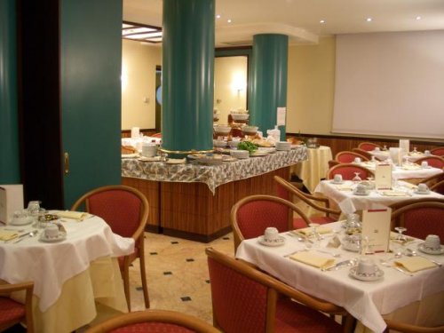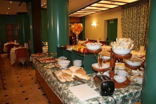 La sala colazione offre un ricco buffet con vasto assortimento di delizie di pasticceria.