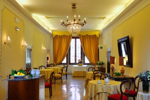 La ricca colazione a buffet è servita al primo piano nobile del palazzo e, quando la stagione lo consente, anche nella graziosa terrazza a piano che si affaccia sul tranquillo canale.