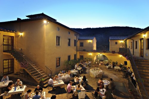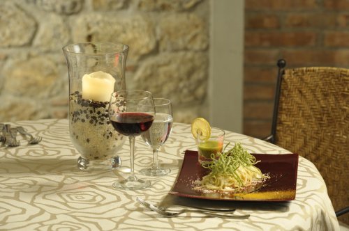 All'interno della suggestiva corte che la sera si veste di stoffe, cristalli e posateria, viene servita la cena al tavolo con la carta, per gustare i sapori dell'orto o i profumi del bosco, attraverso antiche ricette rivisitate per soddisfare il gusto e le abitudini degli ospiti.