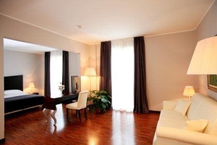 Le camere, confortevoli e di elegante design italiano contemporaneo, sono arricchite da tessuti e legni pregiati, linee pure, colori riposanti, pavimenti in legno, mobili in rovere moro, scrivanie in vetro opaline rosso.