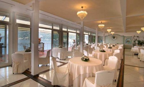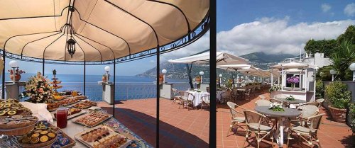 La grande sala Ristorante, dotata di ampio terrazzo panoramico, offre i piatti tipici della costiera amalfitana e della Campania.
