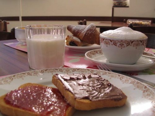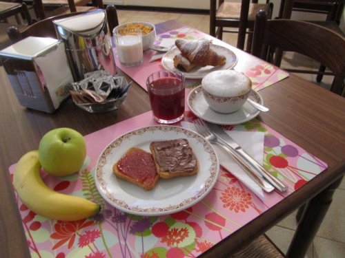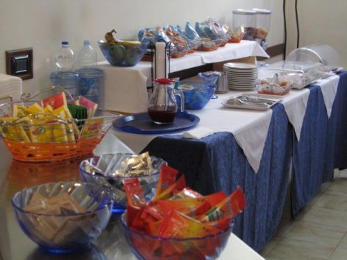 La prima colazione a buffet offre differenti succhi di frutta, yogurt, brioches fresche, affettati di salumi e formaggi, panini e dolci.