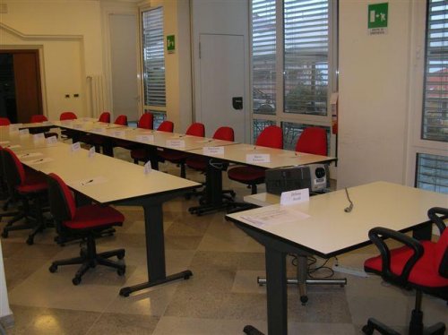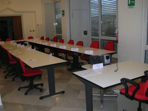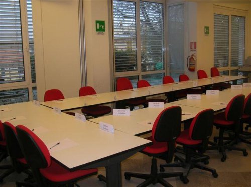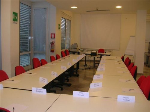 La sala riunioni può essere allestita secondo le necessità del cliente ed è dotata di lavagna luminosa, lavagna a fogli mobili, teli per la video proiezione, connessione Wi-Fi a Internet a pagamento.