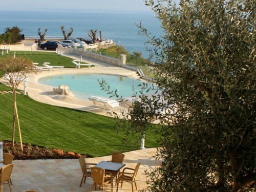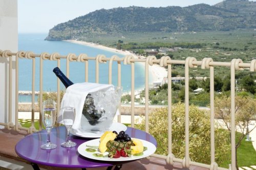 Durante la bella stagione è possibile accomodarsi presso la terrazza esterna con piscina, da cui si ammira una splendida vista sulla Baia di Mattinata.