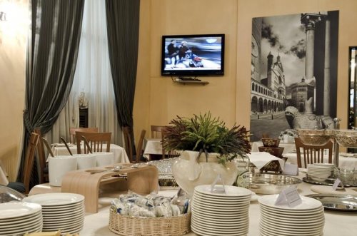 La prima colazione viene servita al mattino in una sala ampia e luminosa, ideale anche per colazioni di lavoro, buffet e banchetti.