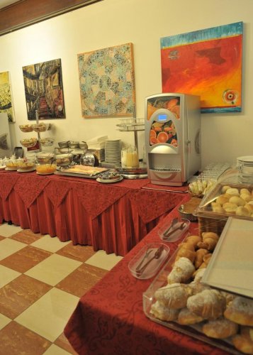 La prima colazione a buffet viene servita nel giardino e nelle sale dell'hotel appositamente allestite, dalle ore 7:30 alle ore 10.30.