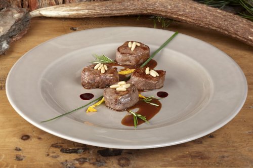 Lo Chef Maurizio Larrazin propone un accurato menù per il trattamento "pensione gourmet", con un antipasto servito al tavolo, un ricco buffet di insalate, verdure fresche e grigliate, un primo piatto a scelta fra 4 proposte, un secondo piatto a scelta fra 4 proposte, una selezione di formaggi Valtellinesi e dolci al buffet.