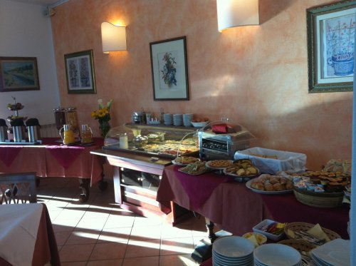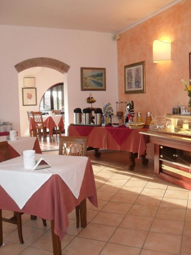 La prima colazione a buffet viene servita nella confortevole Sala per le colazioni e durante la bella stagione nella terrazza panoramica con vista sulle colline del Chianti.