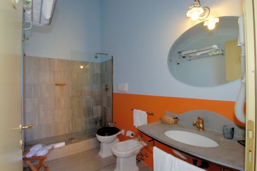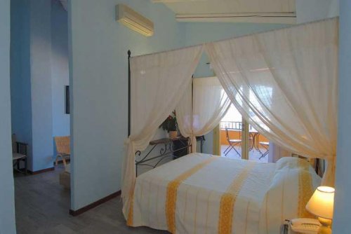 - Junior Suite spaziosa, con salottino e terrazzo privato con vista sul mare, dotata di frigobar, cassaforte, telefono, TV color satellitare, aria condizionata, bagno privato con asciugacapelli.