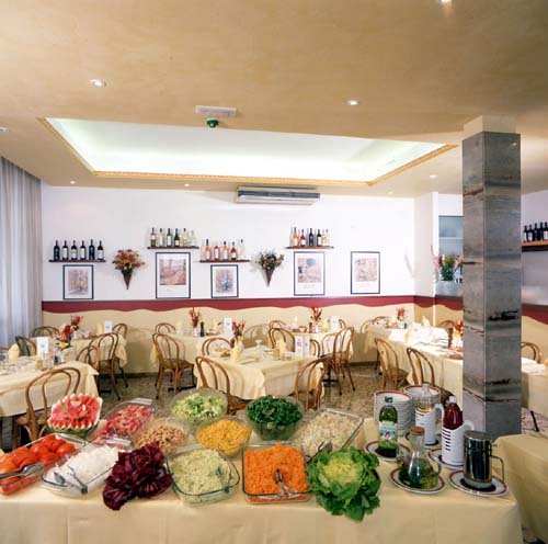 La sala ristorante è molto accogliente e solare con arredamento moderno completamente climatizzata e dotata di uno spazio buffet