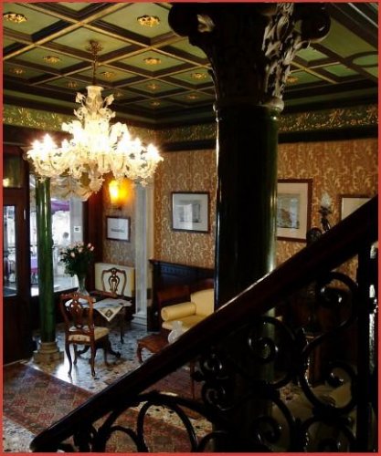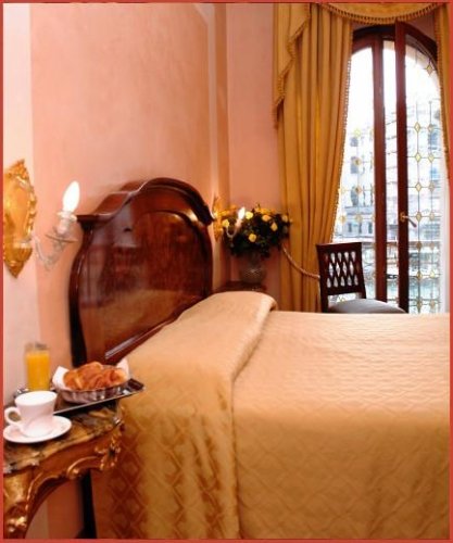 Le camere dell'Hotel Marconi sono arredate in tipico stile veneziano con lampadari in vetro di Murano e tessuti barocchi.