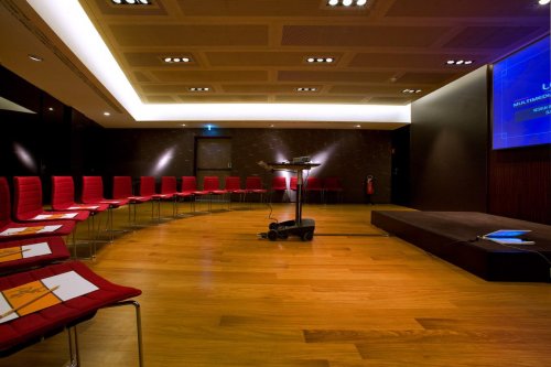 - Sala Maestro di 90 mq con altezza di 290 cm; capacità massima di 65 ospiti, sedute disposte a platea, con palco e podio per relatori, visione su megaschermo a soffitto con retroproiezione, diffusione sonora di altissima qualità, interfacciamento tecnologico per videoconferenza.