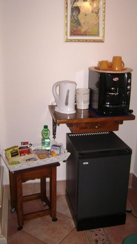 La prima colazione viene offerta in camera con prodotti confezionati: snack salato, snack dolce, succo di frutta, polpa di frutta, fette biscottate, marmellata, acqua minerale (1/2 lt), caffè espresso, the, camomilla ,caffè d' orzo, tisane, cioccolato e cappuccino. Tutte le bevande calde vengono erogate dalla macchina per caffè e dal bollitore che si trovano in camera.