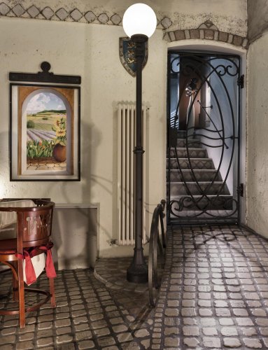 La ricca colazione a buffet viene servita in una saletta molto particolare che richiama l'atmosfera di una tipica piazza di Paese.