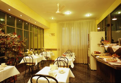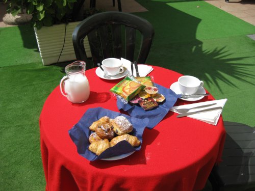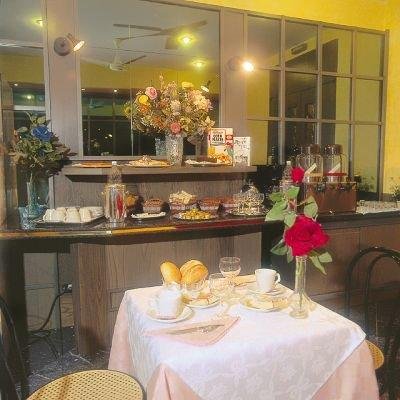La piccola colazione a buffet a base di dolci e prodotti dietetici, viene servita in un'accogliente e raffinata saletta, oppure in giardino durante la bella stagione.