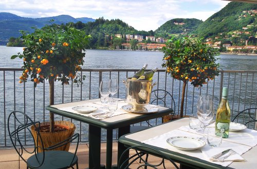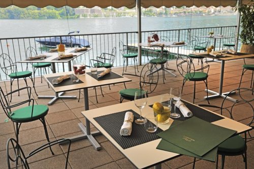 Dalle ampie vetrate si ammira lo splendido panorama che comprende la riva opposta, le colline e la montagna, fino ad abbracciare le cime innevate delle Alpi.