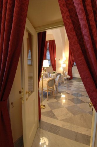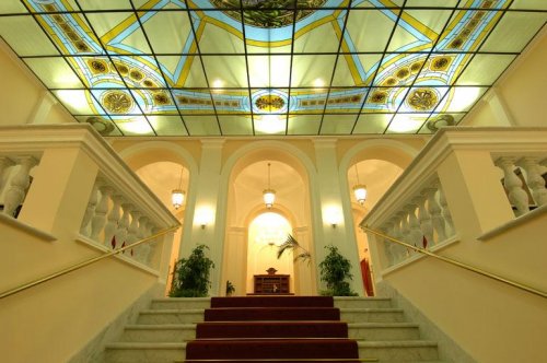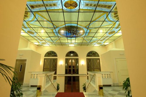 Gli ospiti vengono accolti in un'ampia Hall con prorompente scala di ingresso, arredata in stile classico vittoriano con un caratteristico velario in cui è rapprensentato San Giorgio.
