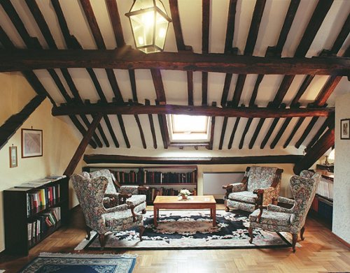 Nella torre è stata ricavata una delle camere più caratteristiche, nella quale è stata lasciata in vista la complicatissima struttura di sostegno della torretta più alta.
