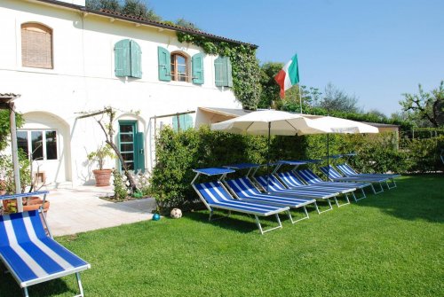 L'ampio giardino esterno accoglie una splendida piscina all'aperto.