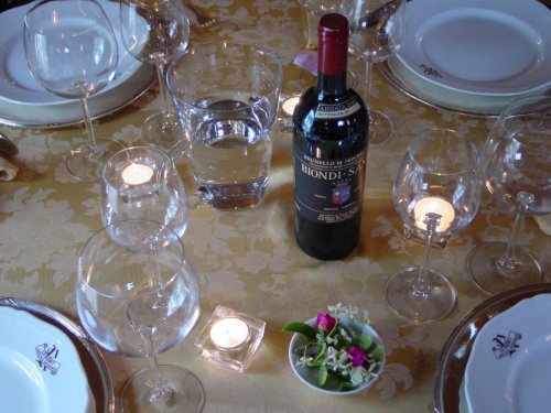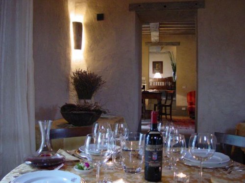 La colazione continentale viene servita nel raffinato ristorante e durante i mesi estivi nel fiorito e ombreggiato portico con vista sul castello di Camporsevoli e sul Monte Cetona.