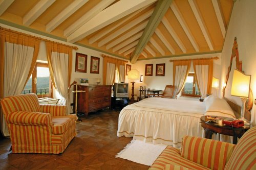 Tutte le stanze godono di una magnifica vista sulle colline circostanti o sul borgo di San Verolo, e dispongono di ampi letti con materassi in lattice, elegante angolo soggiorno, spaziosi bagni in marmo rosso con vasca e doccia (in alcuni casi con idromassaggio).