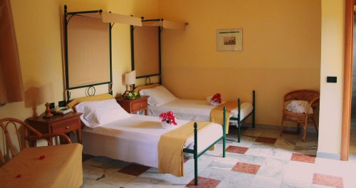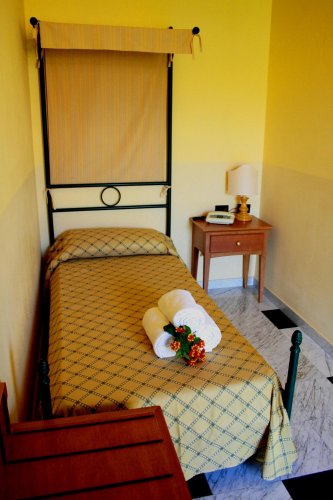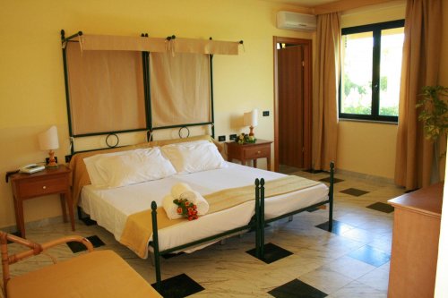Tutte le camere sono dotate di letto in ferro battuto, aria condizionata, cassaforte, TV color, telefono, frigo, servizi privati con asciugacapelli e doccia.