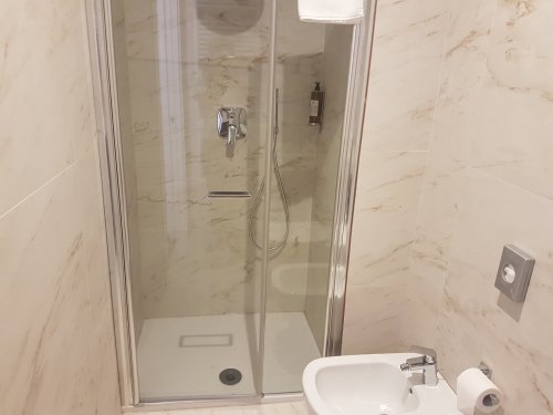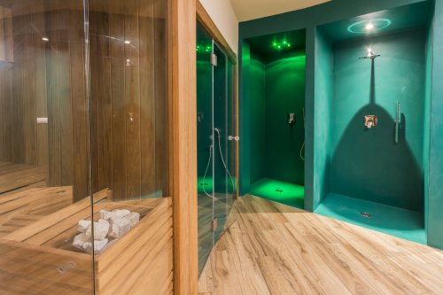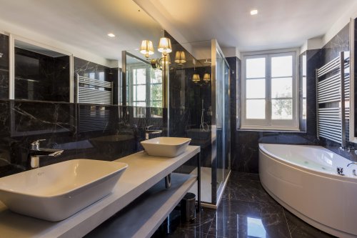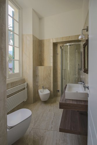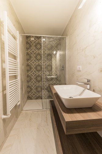 Tutti i bagni sono rivestiti di marmo, cementine e specchi ed offrono comodi spazi per la doccia.