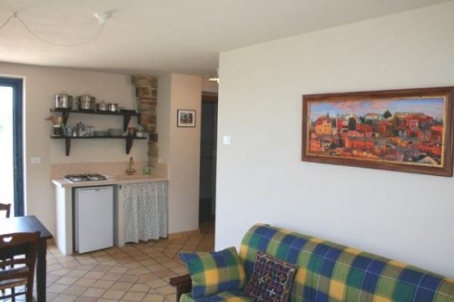 -Il Frantoio: bilocale adibito a 4 persone, con soggiorno ottimamente fornito, divano letto per 2 persone, angolo cucina modernamente equipaggiata, camera da letto matrimoniale.
