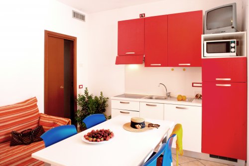 Il Suite Trilocale Bahia di 45 m2 è composto da: soggiorno con due posti letti ad uso divano o divano letto due posti, angolo cottura con piastre elettriche, frigorifero con congelatore, lavastoviglie, forno a microonde, macchina da caffè, orziera, camera con letto matrimoniale, camera con due letti singoli, ampio balcone e loggia coperta arredata con tavolo e sedie.