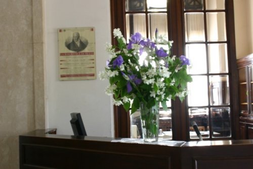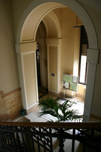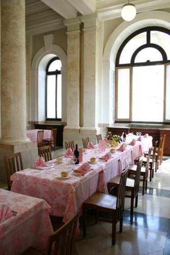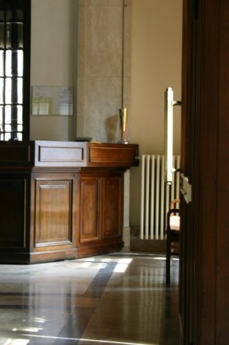 Il salone è illuminato da grandi finestre e la luce riflette sulle bellissime colonne di marmo presenti creando un'atmosfera veramente suggestiva.