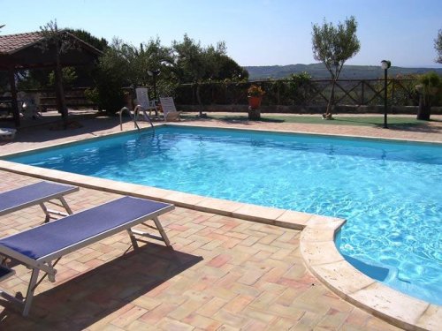 Gli spazi esterni e il bordo piscina sono elegantemente arredati con sdraio, tavoli e sedie da giardino.